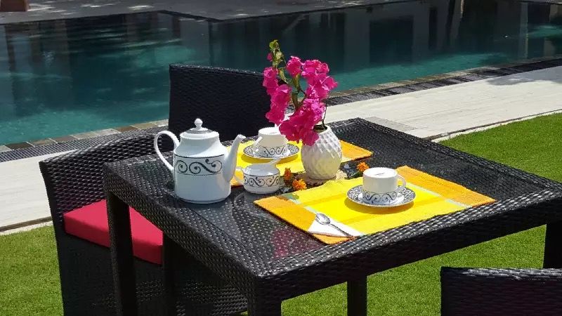 Det boutiquehotell har fem bekväma rum på bottenvåningen, ljusa och rymliga med regndusch, alla utrustade med A/C och fläkt. Vissa rum har även en terrass med utsikt över poolen eller den frodiga trädgården. Den personliga servicen och den familjära karaktären hos hotellet skapar en trevlig atmosfär.